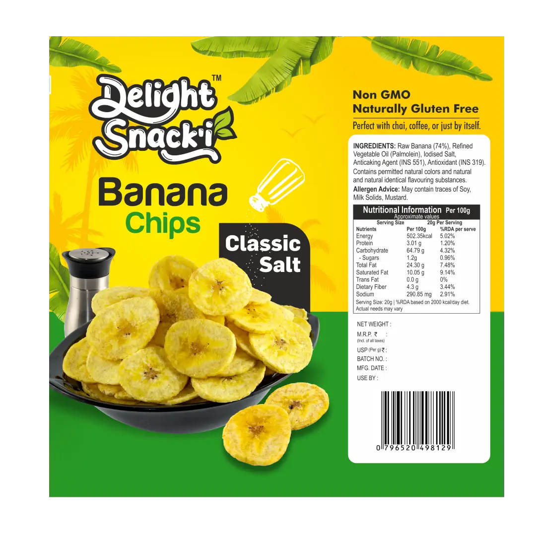 - Ingredients Include: Raw Banana (60%), Refined Vegetable Oil (Palmolein), Iodised Salt, Maltodextrin, Acidifying Agent (INS 330), Antioxidant (INS 319).